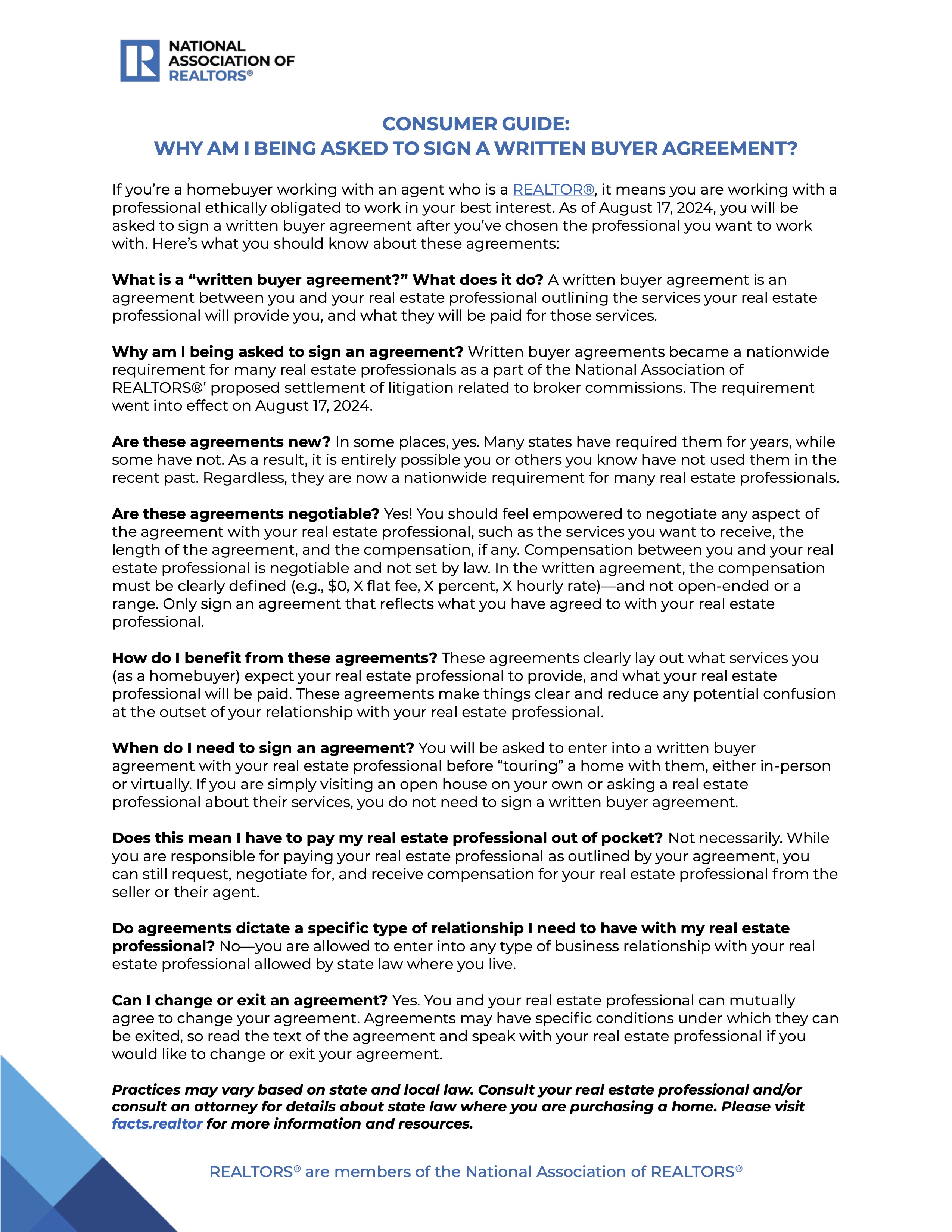Written buyer agreements became a nationwide requirement for many real estate professionals as a part of the National Association of REALTORS®’ proposed settlement of litigation related to broker commissions. The requirement went into effect on August 17, 2024.